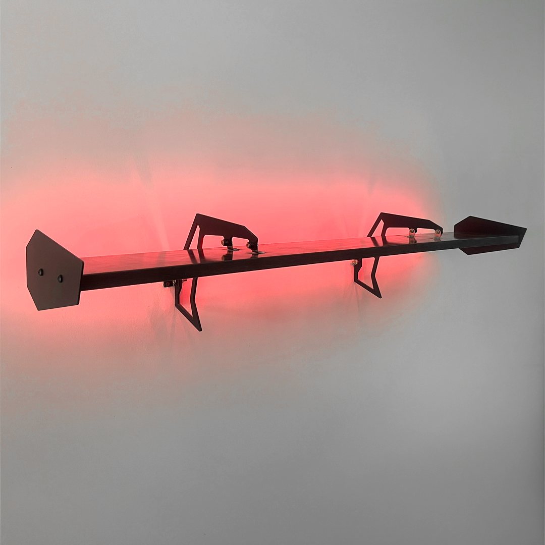 Crafted for durability, this shelf boasts powder-coated steel and high-quality wooden panels that blends beautifully with the matte black supports. The Inverted Racecar Wing Shelf is built to last, combining modern style with long-lasting performance, ideal for showcasing your prized collections or personal items in a space that’s all about making a statement.